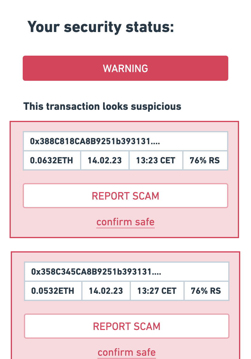 Polyzoa is a Chrome extension that connects to your wallet and constantly monitors it for scam attacks. Our data scientists and researchers are tirelessly working on finding new crypto cyber threats and creating non-trivial ways for automated detection and prevention of such threats. Without sharing sensitive information such as your signing key or personal details, you can connect any wallet address to add an extra layer of security and protection to it.